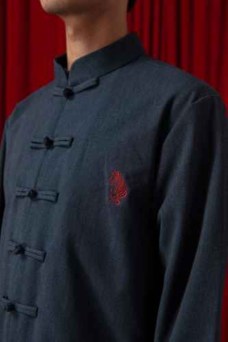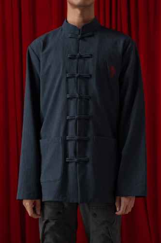 Belanja SekarangThis men’s shirt features a traditional Chinese-inspired design with a stand mandarin collar and a series of classic chinese button closures down the front. Crafted in a denim-look fabric, it offers a clean and structured silhouette with long sleeves and two practical front pockets. A subtle embroidered motif on the chest adds a refined cultural touch, balancing heritage style with modern simplicity.