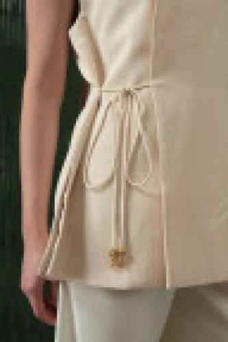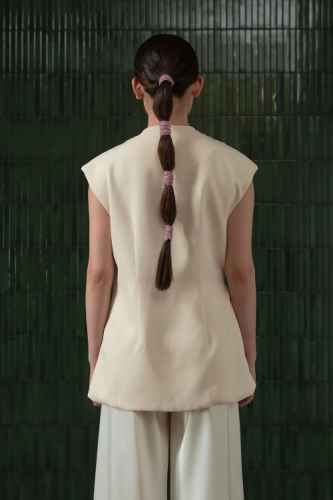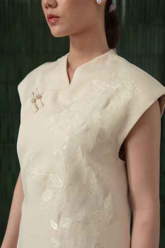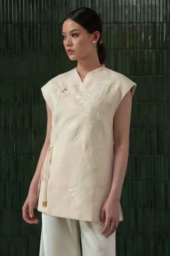 Belanja SekarangThis top features structured padded shoulders that create a sharp, elegant silhouette. It is adorned with delicate floral embroidery on the front for a refined, feminine touch. The design includes a mandarin collar and a side tie detail with hanging beads, adding a subtle traditional charm to its modern, tailored look.