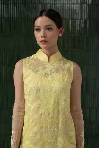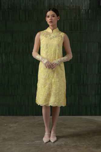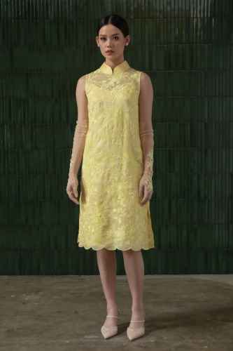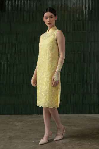 Belanja SekarangThis sleeveless dress features a pastel yellow tone with delicate floral embroidery that adds texture and sophistication. The sheer fabric and structured mandarin collar bring a refined, modern-oriental touch, while the scalloped hemline enhances its feminine charm.
