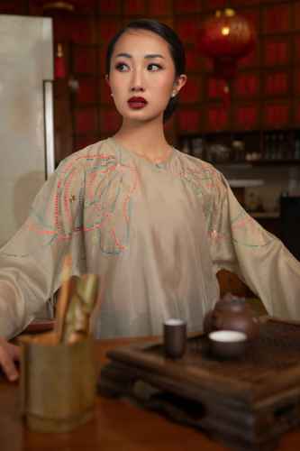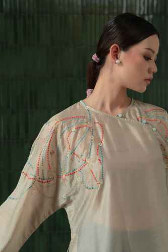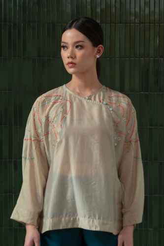 Belanja SekarangThis top is crafted from a sheer fabric with a relaxed silhouette and subtle sheen. It features intricate multicolored embroidery across the shoulders and upper back, adding a touch of artisanal charm. The design includes a side tie detail with delicate bead accents, creating a refined drape and adjustable fit.