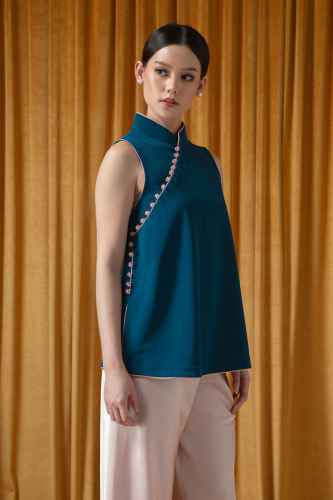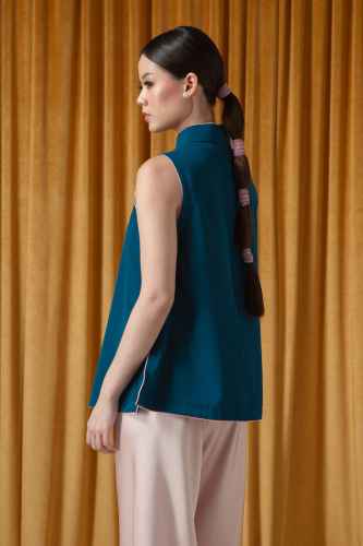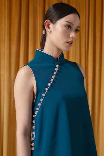 Belanja SekarangThis sleeveless top offers a modern, minimalist take on traditional oriental styling. It features a clean A-line silhouette paired with a subtle mandarin collar for a refined touch. The standout detail is the asymmetric piping in contrasting fabric and buttons that trail diagonally across the front, adding a playful yet elegant contrast.