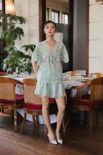 Belanja SekarangThis top is a delicate sheer blouse, featuring intricate floral embroidery throughout. It has short flared sleeves and scalloped edges that enhance its feminine charm. The front is adorned with ribbon tie fastenings, creating a graceful, romantic look perfect for a light and airy outfit.