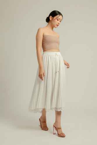 Belanja SekarangThis is a long pleated skirt made with lightweight cotton fabric. It has elastic waistband for comfortable fit. The hem is layered with lace trim adding delicate, feminine touch