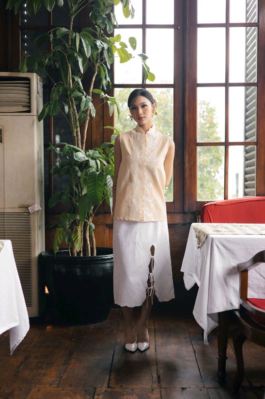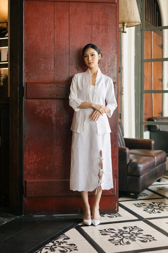 Belanja SekarangA contemporary take on the classic sarong, this embroidered white skirt is crafted from linen fabric adorned with delicate florals motifs along the hemline. The side slit is accented with adjustable ribbon ties, adding a soft feminine touch while allowing ease of movement. Ideal for festive occasions or styled casually with a minimalist top.