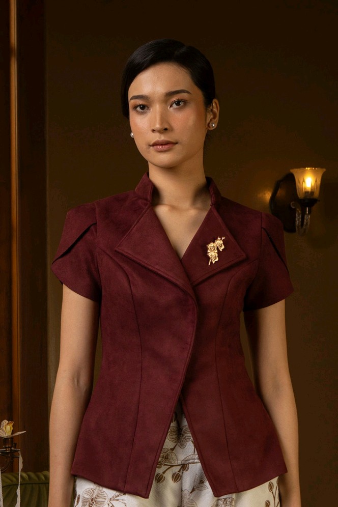 This suede top features a tailored, feminine silhouette with a structured lapel-style collar that adds a refined touch. Designed with our Signature Ajeng Top's sleeves and clean paneling, it softly contours the waist for a flattering fit. The front opening creates a sleek, elongated line, while the rich suede texture brings warmth and understated elegance, making it perfect for a polished yet modern look.