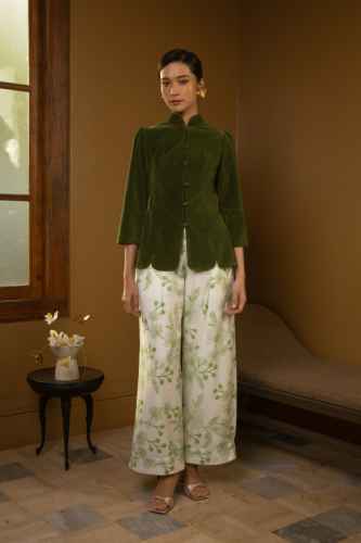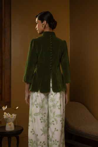 Belanja SekarangThis velvet jacket has a structured, tailored fit. It features a high mandarin collar and Chinese knot buttons at the front. The waist is fitted, flaring out slightly at the hips to create a peplum-like silhouette with scalloped hems. The back has a line of chinese knots running down the center, adding an elegant, vintage touch.