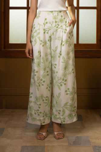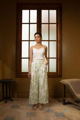 These pants feature a high-waisted, wide-leg silhouette that creates an elegant and elongated look. Crafted from textured fabric, they are adorned with a floral Batik motif inspired by orchids, adding a fresh and feminine touch. The structured waistband with subtle curved panel detailing enhances the fit at the waist, while the flowing legs offer comfort and graceful movement