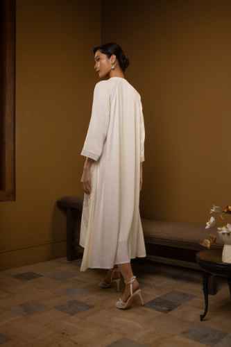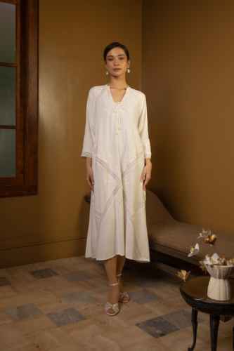 Belanja SekarangThis dress features a relaxed, flowing silhouette crafted from linen fabric in a broken white tone. It is detailed with delicate floral embroidery and geometric lace inserts that run across the bodice, sleeves, and skirt, creating an elegant panelled effect. Finished with a subtle tie-up neckline and wide long sleeves, the design feels feminine, graceful, and effortlessly refined.